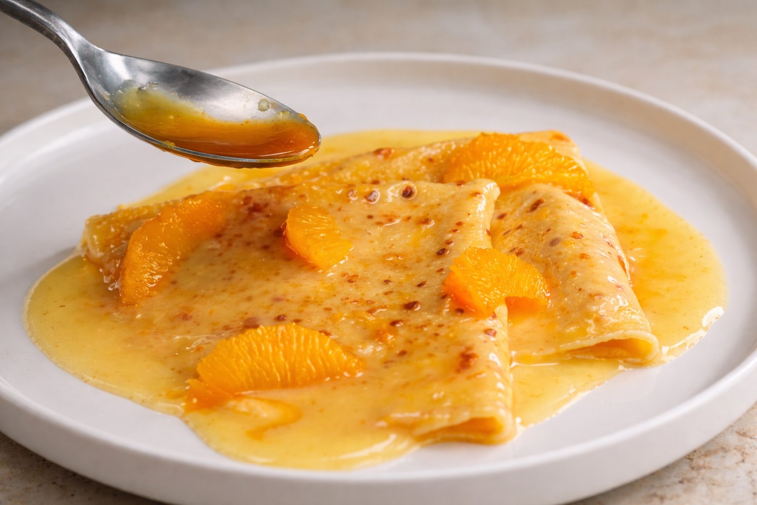Mehl, Salz, Zucker, Eier und Milch zu einem glatten Teig verrühren, zum Schluss geschmolzene Butter und optional etwas Orangenabrieb unterrühren. Den Teig ca. eine Stunde ruhen lassen. In einer beschichteten Pfanne mit wenig Butter bei mittlerer Hitze dünne Crêpes von beiden Seiten goldgelb ausbacken.