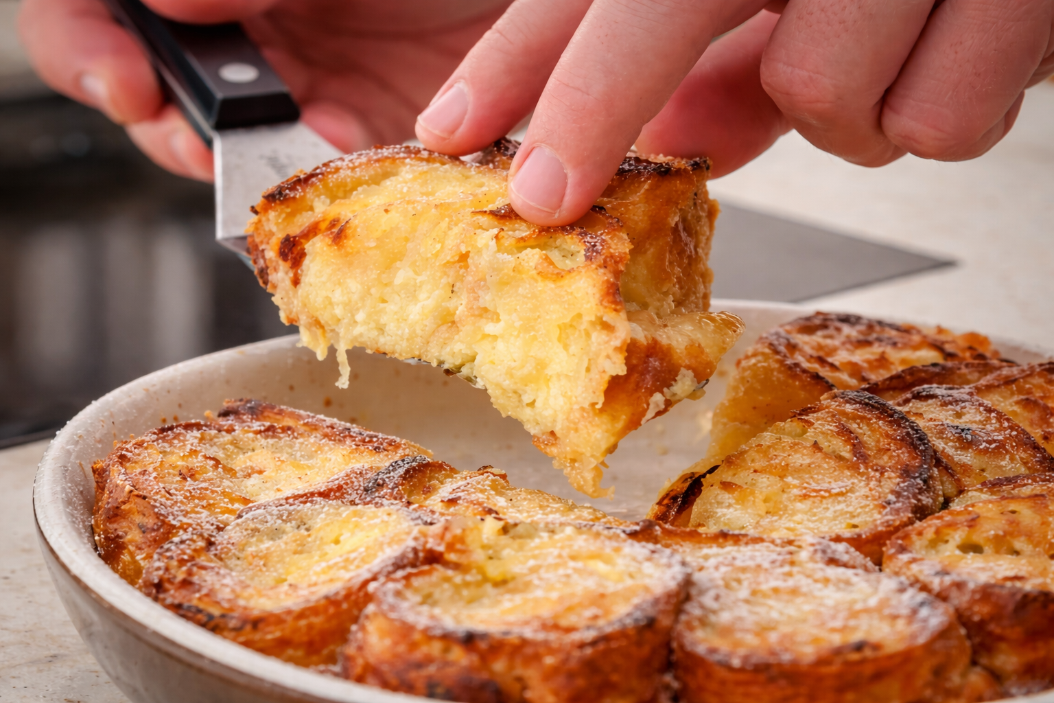 Brot in ca. zwei fingerbreite Scheiben schneiden. Eier, Milch, Zucker, Salz und Zitronenabrieb gut vermengen, dann die Brotscheiben darin tränken. Eine beschichtete Pfanne mit Butter ausstreichen und die Scheiben darin rundum goldbraun ausbacken. Die Schnittflächen mit Puderzucker bestreuen und nochmals erhitzen, bis der Zucker karamellisiert. Die French Toast können im Ofen bei 70 °C Ober-/Unterhitze warm gehalten werden.