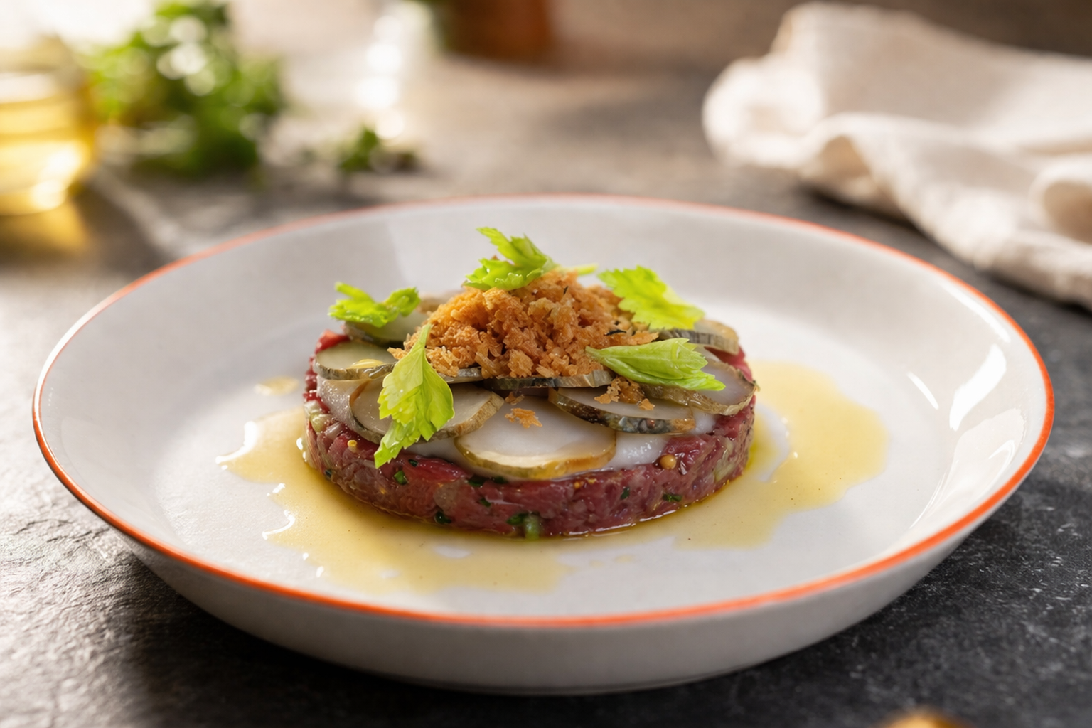Für das Tatar befreist du die Rindshuft von Sehnen und schneidest sie anschliessend in ca. 5 mm grosse Würfel. Schäle den Sellerie und schneide ihn ebenfalls in ca. 5 mm grosse Würfel.