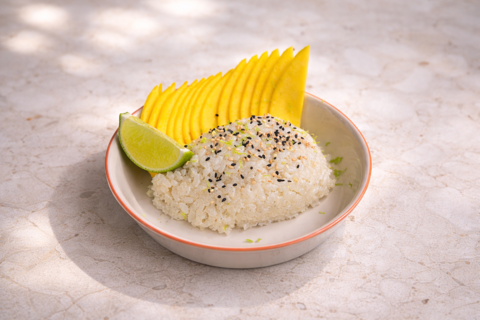 Die Mango und den Sesam zu dem Reis servieren.