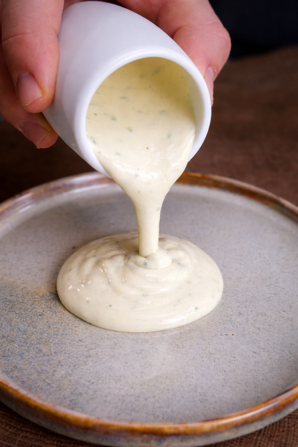 Nach dem Abkühlen mit Eigelb und Senf vermengen. Unter ständigem Mixen das Öl nach und nach zugeben, sodass eine Emulsion entsteht.