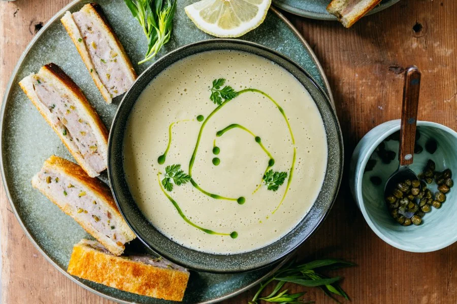 Kalbsbrät in eine Schüssel geben und mit allen Zutaten bis und mit den Sardellen gut vermengen, mit Salz und Pfeffer abschmecken. Das Brät gleichmäßig auf zwei Toastscheiben verteilen, jeweils mit einer weiteren Toastscheibe bedecken und die „Sandwiches“ in Olivenöl beidseitig goldbraun ausbacken. Sollte das Kalbsbrät noch nicht vollständig durchgegart sein, im Ofen bei 180 °C Umluft fertig garen. Anschließend nach Belieben zerteilen und zur Suppe servieren.