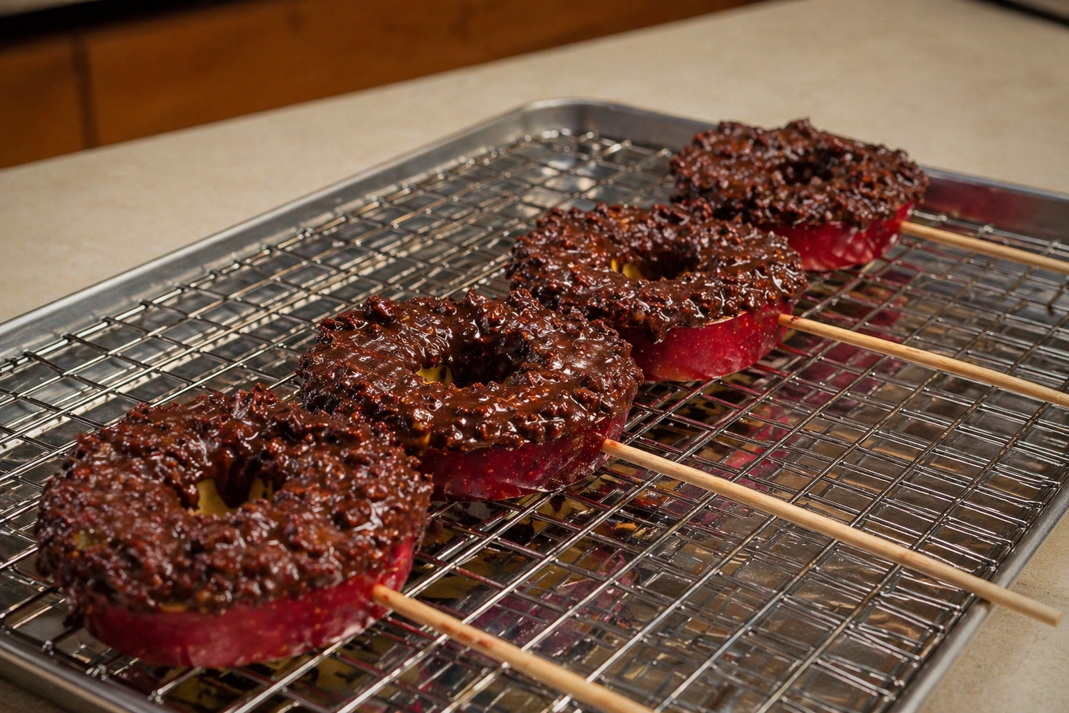 Apfelscheiben auf Spiesse stecken und die Schokoladenmasse darüber verteilen. Kühl stellen und nach ca. 10 Minuten sind sie fertig.