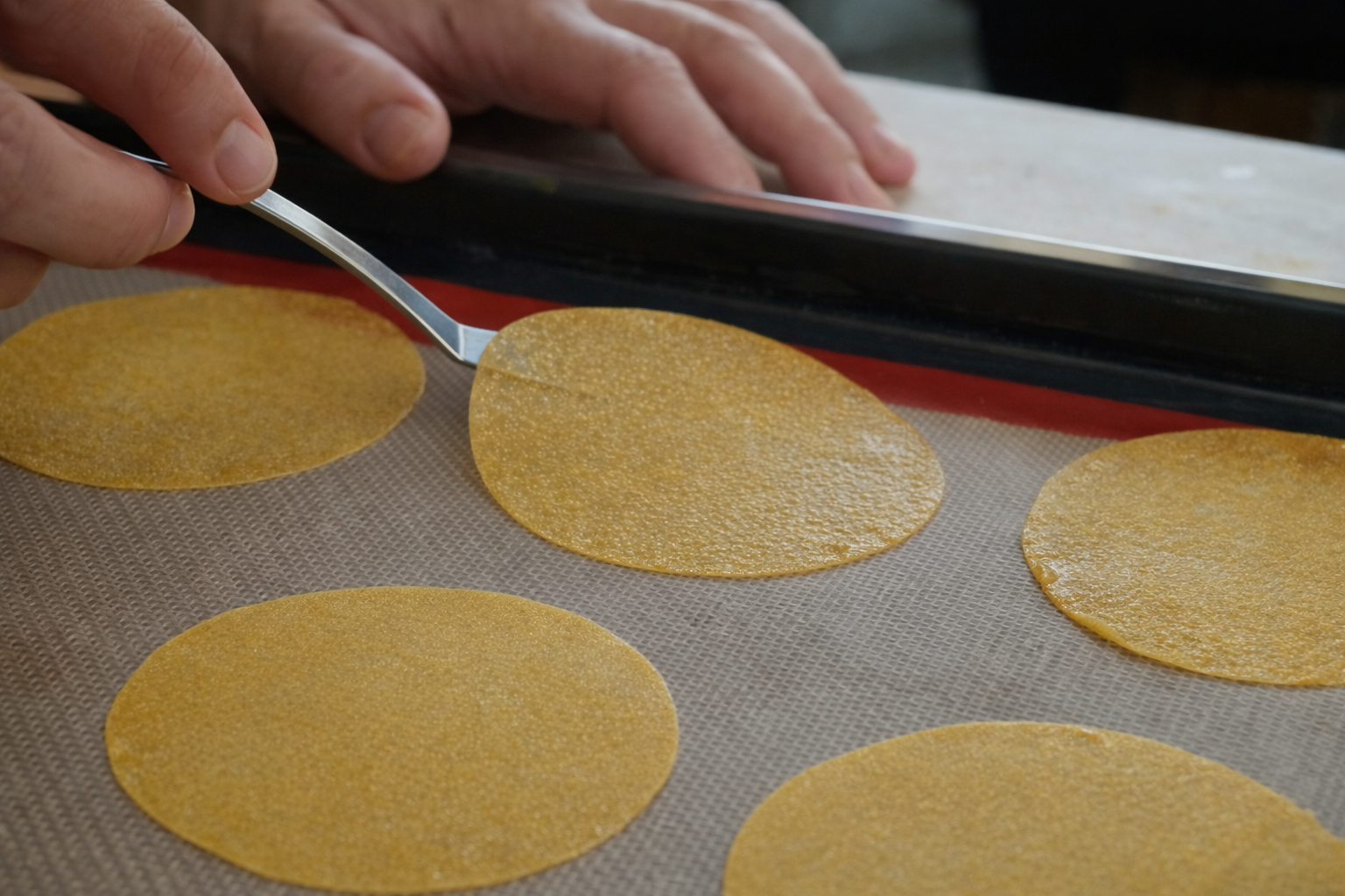 Fruchtfleisch mit dem Zucker pürieren und kurz erhitzen. Danach Säure zugeben und etwas auskühlen lassen. Eiweiss zugeben und gut vermengen. Die Masse durch ein feines Sieb passieren und auf einer Backmatte fein ausstreichen. Im Ofen bei 100°C Umluft ca. 45 min trocknen lassen.