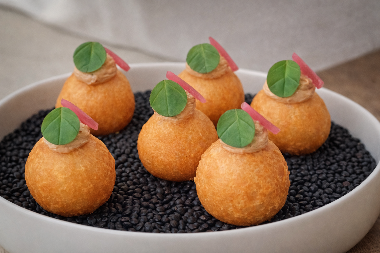 Zu den Kugeln könnt ihr auch eine süße Creme oder ein Chutney servieren. Zum Präsentieren habe ich Belugalinsen in einer Schale verteilt und die Pralinen darauf angerichtet.